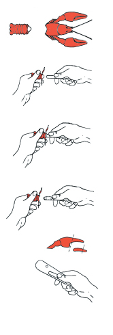 Käyttöohjeet Katkaise ensin rapu. Ota ravunpyrstöstä kiinni alapuoli itseesi päin ja rapuneula toiseen käteen. Työnnä rapuneula pyrstön sisään selkäpanssarin ja lihan väliin. Pyöräytä hieman rapuneulaa ja vedä rapuneula ulos, jolloin pyrstön liha irtoaa vaivattomasti. Irrota saksen pienempi haara. Katkaise sen kärki rapuneulan reiällä ja imaise se tyhjäksi. Katkaise suuremman haaran kärki tarvittaessa rapuneulan kaarella aivan kärjen tyvestä. Tyhjennä ravun saksi rapuneulalla. Bryt av stjärten. Fatta tag i kräftstjärten med med skalet neråt och håll Krätnålen i andra handen. Tryck in Kräftnålen mellan skalet och köttet. Vrid Krätfnålen mot dig, från dig, några gånger. Drag ut Krätnålen varvid köttet lossnar med lätthet. Bryt av den rörliga klon med Krätgnålens lilla runda hål och sug ut innehållet. Bryt saxens fasta del med Kräftnålens båge. Peta ut köttet med Kräftnålen.